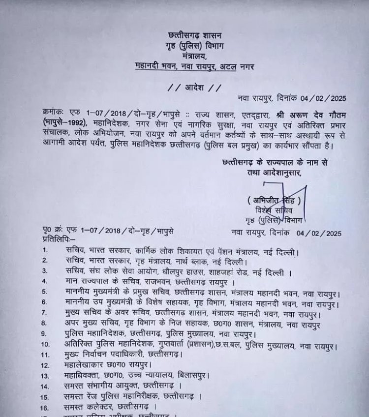गृह विभाग ने जारी किया आदेश :गृह (पुलिस) विभाग, मंत्रालय, महानदी भवन, नवा रायपुर द्वारा जारी आदेश (क्रमांक: एफ 1-07/2018/दो-गृह/भापुसे) में कहा गया है कि श्री गौतम को उनके वर्तमान दायित्वों के साथ-साथ पुलिस महानिदेशक की अतिरिक्त जिम्मेदारी दी गई है। विशेष सचिव, गृह (पुलिस) विभाग अभिजीत सिंह द्वारा जारी इस आदेश में स्पष्ट किया गया है कि यह नियुक्ति अस्थायी रूप से आगामी आदेश तक प्रभावी रहेगी।