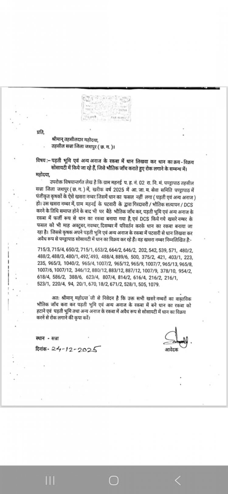 जशपुर जिले के ग्राम महनई प. ह. नं. 02 रा. नि. मं. पण्ड्रापाठ तहसील सन्ना जिला जशपुर (छ.ग.) में खरीफ वर्ष 2025 में आ. जा. म. सेवा समिति पण्ड्रापाठ में पंजीकृत कृषकों के ऐसे खसरा नम्बर जिसमें धान का फसल नहीं लगा (पड़ती एवं अन्य अनाज) हो, उस खसरा नम्बर में ग्राम महनई के पटवारी के द्वारा गिरदावरी / भौतिक सत्यापन / DCS करने के तिथि समाप्त होने के बाद भी घर बैठे भौतिक जाँच कर, पड़ती भूमि एवं अन्य अनाज के रकबा में फर्जी रूप से धान का रकबा बनाया गया है।