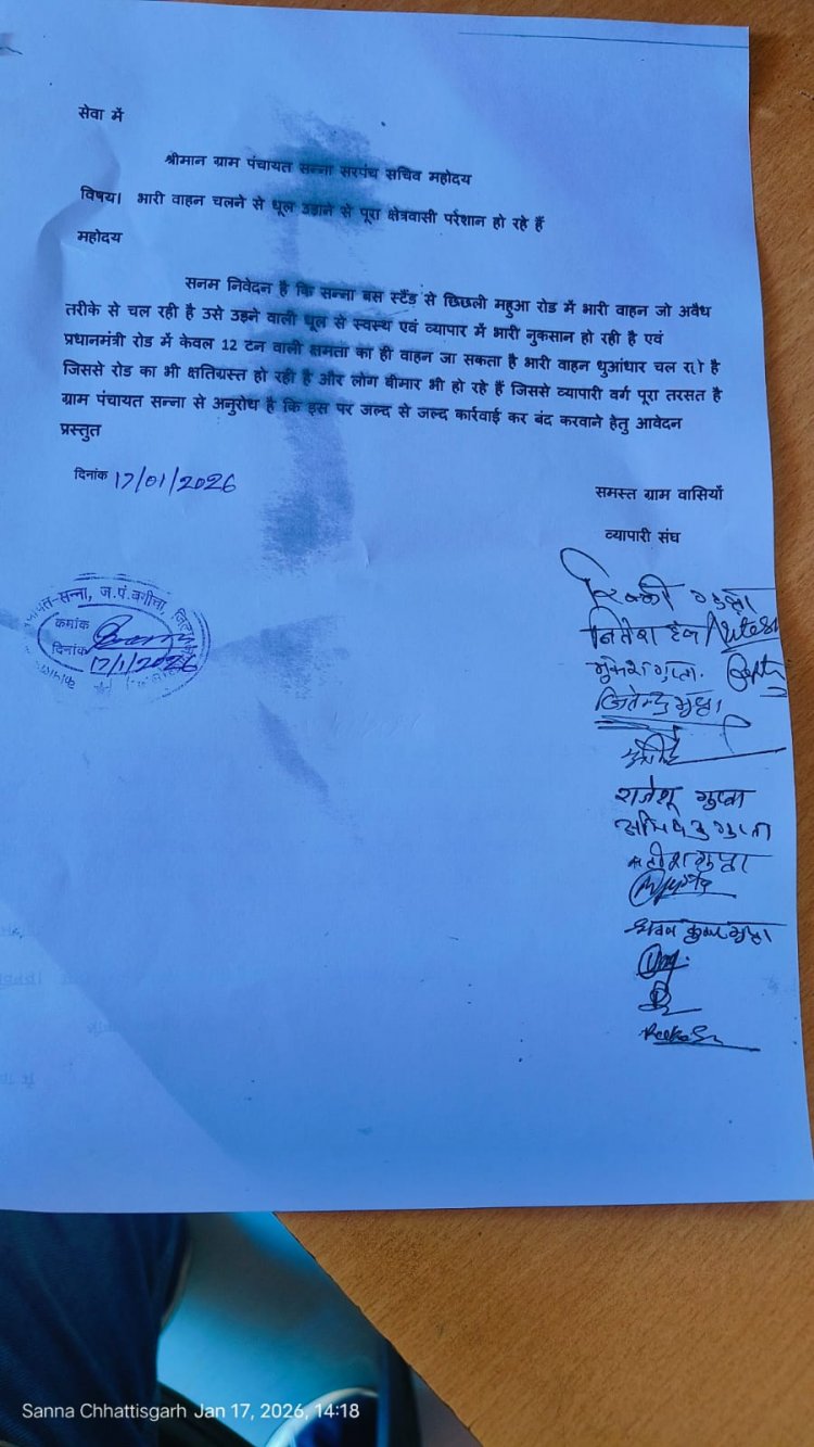 जशपुर सन्ना 17 जनवरी 2026/ ग्राम पंचायत सन्ना अंतर्गत बस स्टैंड से छिछली मुख्य मार्ग पर अवैध रूप से संचालित भारी वाहनों से क्षेत्रवासी गंभीर परेशानियों का सामना कर रहे हैं। ग्रामीणों का कहना है कि भारी वाहन न केवल इस संकरे मार्ग पर प्रतिबंध के बावजूद चल रहे हैं, बल्कि अत्यधिक तेज रफ्तार से गुजरते हैं, जिससे हर समय दुर्घटना की आशंका बनी रहती है।