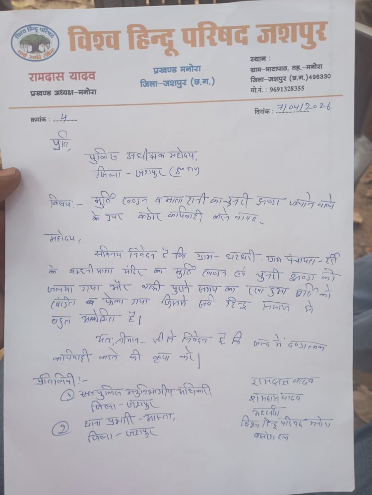 जशपुर के धरधरी गांव में प्राचीन मंदिर बना निशाना, मूर्तियां तोड़ीं, ध्वज जलाया—आक्रोश उफान पर, विहिप ने की 48 घंटे में गिरफ्तारी की मांग