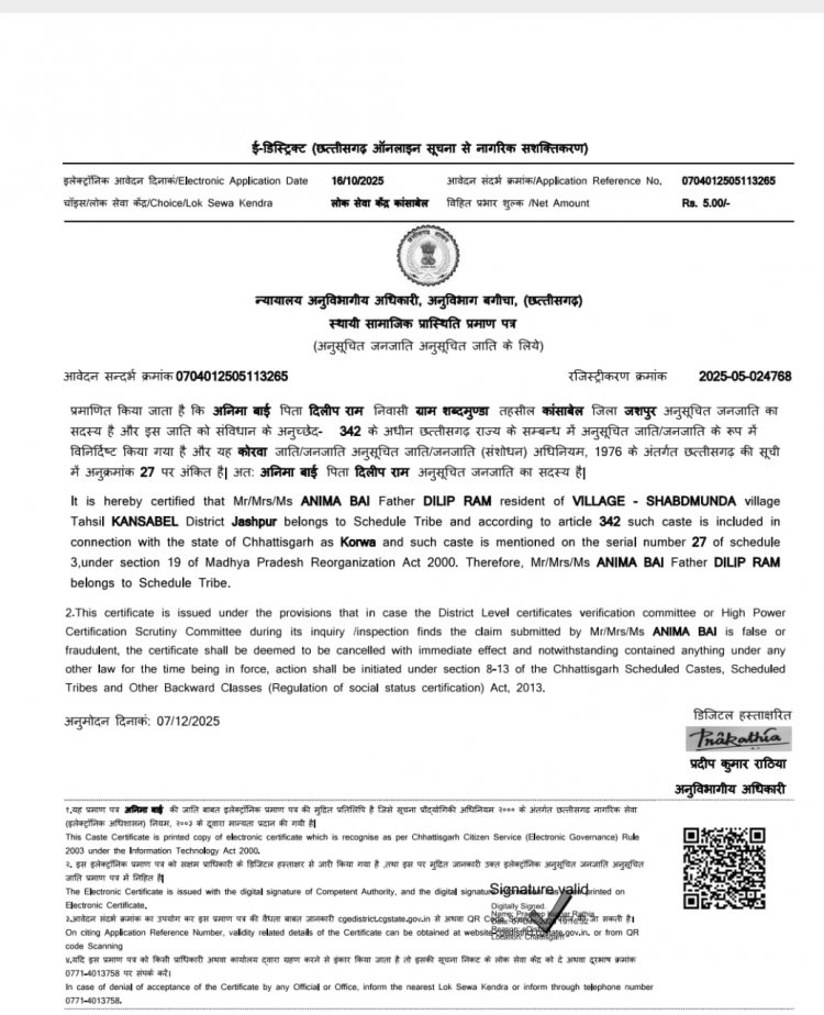 जशपुर - कल्याण आश्रम के पहल से 12 कोरवाओं का स्थायी जाति प्रमाण पत्र बनने से जगी उम्मीद...!