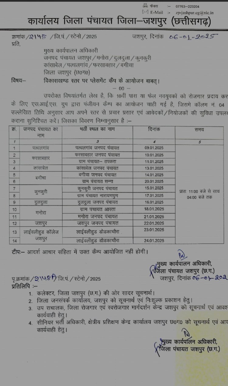 पात्र अभ्यर्थी 22 जनवरी 25 को दिन बुधवार को समय प्रातः 11ः00 बजे से आवेदक समस्त मूल प्रमाण पत्रों एवं पासपोर्ट साई फोटो, आधार कार्ड, पैन कार्ड के साथ उक्त दिनांक को रोजगार एवं स्वरोजगार मार्गदर्शन केन्द्र जशपुर (छ0ग0) में उपस्थित होकर प्लेसमेंट कैम्प में भाग ले सकते है।
