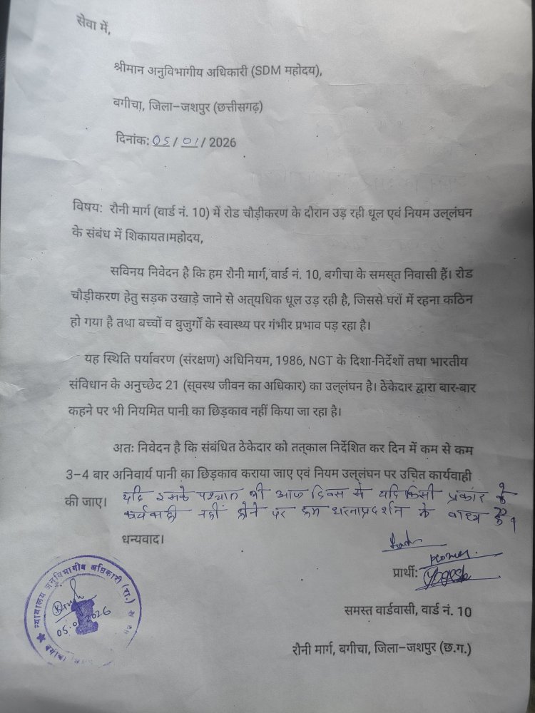 ज्ञापन में चेतावनी दी गई है कि यदि शीघ्र ही प्रभावी कार्रवाई नहीं की गई और धूल नियंत्रण के ठोस उपाय नहीं किए गए, तो वार्डवासी मजबूर होकर धरना-प्रदर्शन जैसे आंदोलनात्मक कदम उठाएंगे, जिसकी पूरी जिम्मेदारी प्रशासन और संबंधित ठेकेदार की होगी।